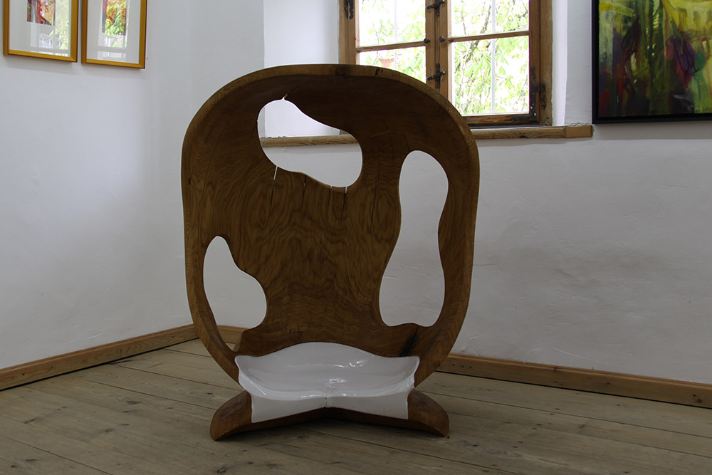 Das Material lässt mir einerseits große Freiräume, andererseits schränkt es die Möglichkeiten stark ein. Wie ist das zu verstehen? Ist ein Baum sehr groß gewesen, kann ich mit meiner Formensprache aus dem Vollen schöpfen. So das Holz durch und durch gesund ist, stehen mir so gut wie alle Formen offen. Hat ein Stück Holz durch Äste oder einen partiellen Schaden bereits eine eigene Form, bin ich dazu aufgerufen, diese "nur noch" auszuarbeiten.